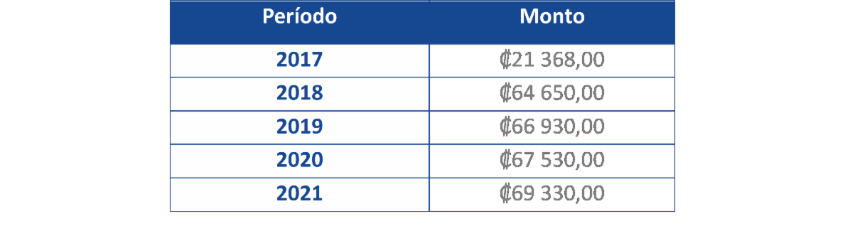 Una vez recibida la solicitud, la Dirección General de Tributación procederá a incluir en el sistema dichos periodos y el pago se podrá realizar por medio de Débito en Tiempo Real (DTR) en la página web de la entidad bancaria que elija la persona interesada o directamente en ventanilla con solo indicar el número de identificación de la persona jurídica. El monto por cancelar será, para cada periodo, el que se detalla a continuación: